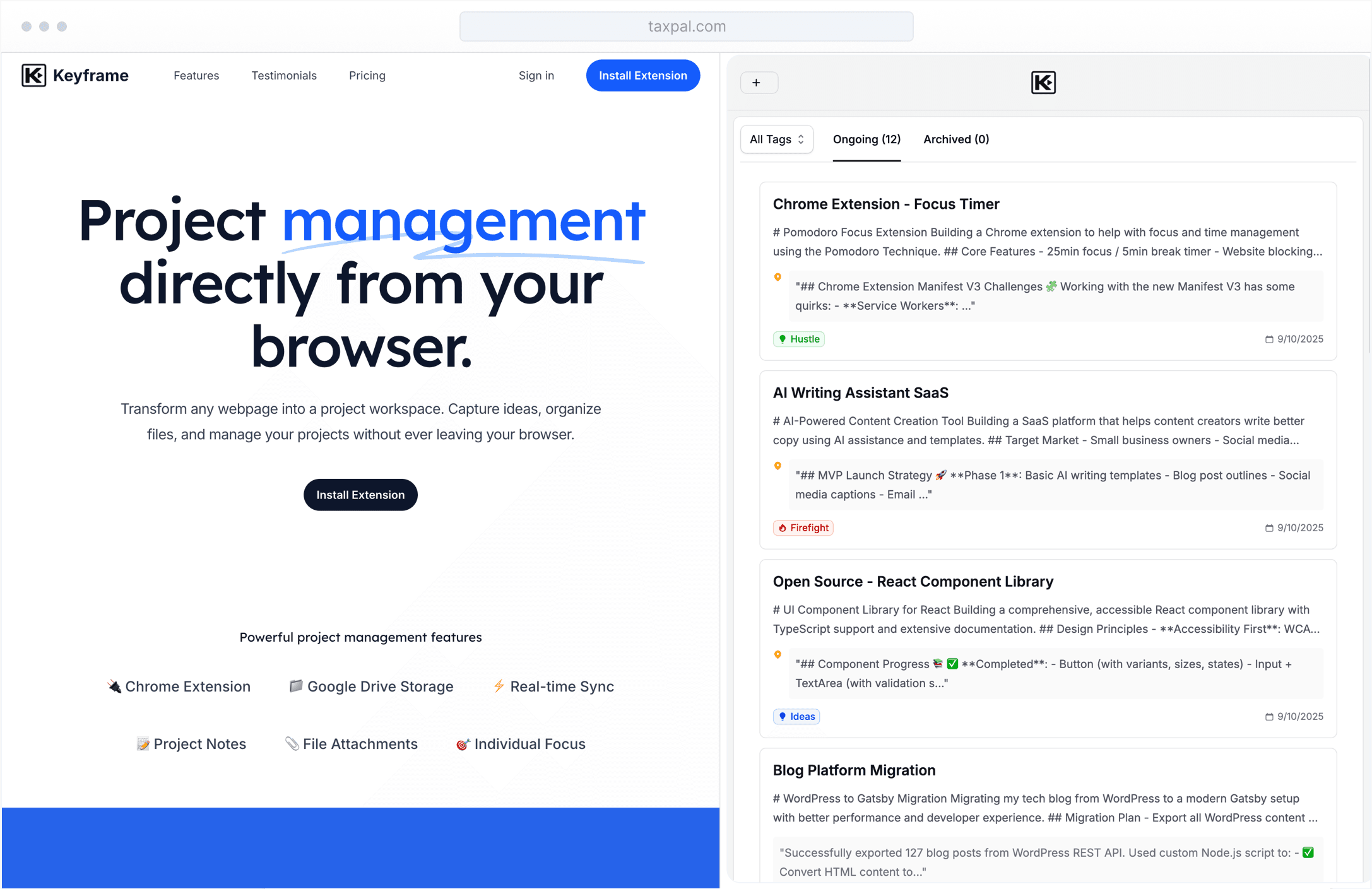 Keyframe transformed how I manage my projects. Having everything accessible from any webpage with just a click is a game-changer for my productivity.